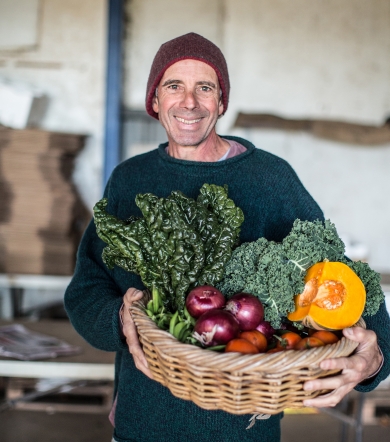 Without synthetic chemicals or pesticides, Chris and Adam have to be innovative in how they protect their crops, which range from leafy salad greens like kale, lettuce and silverbeet, to herbs and purple garlic that thrive in the alluvial soil.