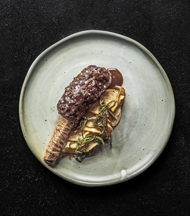 To serve – heat the beef glaze in a small pot. Spoon the warm parsnip purée onto the centre of each plate. Fold the celeriac sheets over the top. Add the beef lollipop and finish with the grilled sea blite, beef glaze, and a sprinkle of sea salt.