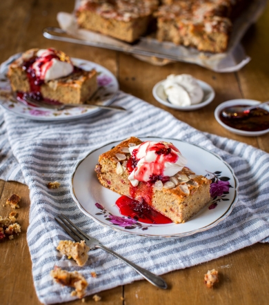 To make the cake – preheat an oven to 160°C. Beat the ricotta, eggs yolks, vanilla extract, beetroot juice, lemon juice, cocoa and sugar with an electric mixer until smooth. Stir in the almond meal, hazelnut meal, grated beetroot and lemon zest and mix well to combine. In a separate bowl- whisk the egg whites to form soft peaks. Fold in a third of the eggs whites to loosen, then gently fold through the rest. Spread into a suitable, lined cake tin and sprinkle over the flaked almonds. Bake for about 1 hour or until a skewer comes out clean. Allow to cool completely.