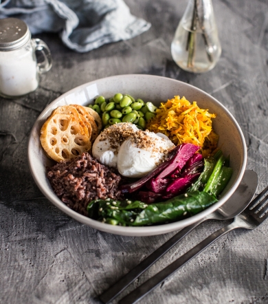 To finish – arrange the sauerkraut, red rice, lotus root, beetroot, edamame and Asian greens in equal proportions in a shallow bowl. Finish with the two poached eggs in the middle and a sprinkling of salt and pepper.