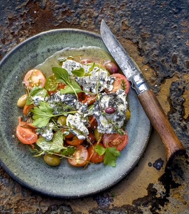 To serve – toss the olives and parsley through the salad and divide onto serving plates. Remove the curd from the pan and place it burnt side up onto the salad. Sprinkle with salt and serve