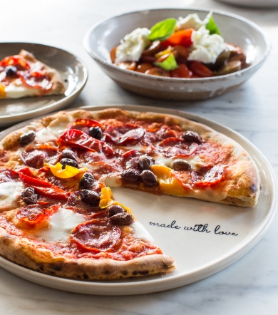 To make the pizza – preheat a wood oven or a pizza stone in your domestic oven turned to its highest setting. Dust a bench with semolina and roll a portion of your pizza dough 40cm in diameter. Spread 2 large tablespoons of sauce evenly over the pizza base. Tear up the fior di latte mozzarella and scatter evenly over the base. Arrange over the slices of hot salami, followed by the olives and roasted peppers. Place the pizza into the oven and cook, turning regularly to ensure even cooking and colouration on the edges.