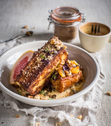 To serve – place some Sauternes custard into the bottom of each bowl. Add a few slices of French toast and top with the rehydrated raisins, mandarin pieces and hazelnuts.