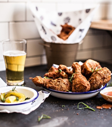 To cook the chicken – heat the oil in a pot over a medium-high heat, or bring to 180°C in a deep fryer. Working in batches, gently fry the chicken until golden, then drain on paper towel. Season well with salt and serve with pickle fingers.
