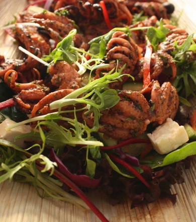 To serve – remove octopus from container and rinse excess marinade. Chargrill for two minutes. Serve on fresh garden salad, dressed with sweet chilli and balsamic honey reduction.