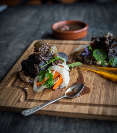 To serve – spoon some cauliflower purée onto a plate and top with beef cheeks. Add the carrots from the saucepan and finish with a splash of braising liquid.