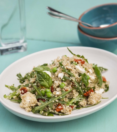 Remove the quinoa from the fridge and place in a large serving bowl. Add the peas, semi-dried tomatoes, feta and roquette, and toss together with the basil vinegarette. Season to taste and serve.