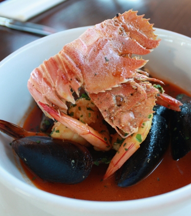 To make the seafood – heat the oil in a large pot. When hot add mussels and close lid. Cook for three minutes or until mussels open. Remove mussels and set aside. Add the remaining seafood to pot with 200ml of reserved saffron infused fish stock and bring to the boil. Cook for 3-5 minutes. Add mussels and an additional 800ml of fish stock. Bring to the boil and immediately spoon into the serving dish.