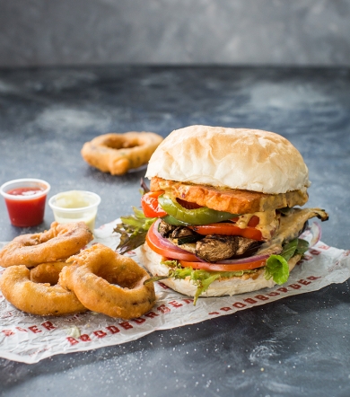 To serve – cut the buns in half and place under a grill. Lightly toast, then spread each side with aioli and relish. To assemble, place some vegetables onto each burger with salad leaves and haloumi. Serve with freshly fried onion rings.