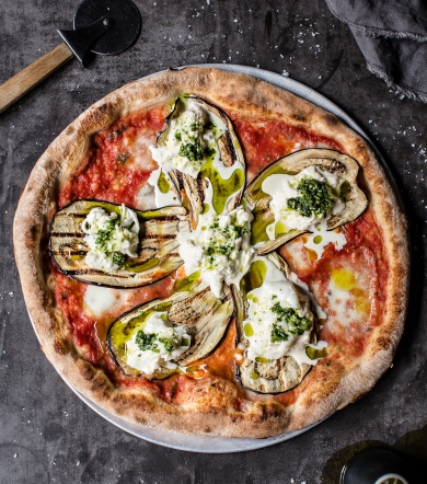 To finish – preheat an oven to 185⁰C. Chargrill the eggplant with some oil on a barbeque or griddle pan. Pass the tomatoes through a sieve, then spread onto each pizza base. Tear the fior di latte over the top, then cover the pizza with eggplant. Bake in the oven for 10-15 minutes, or until the cheese has melted and the base is crisp.