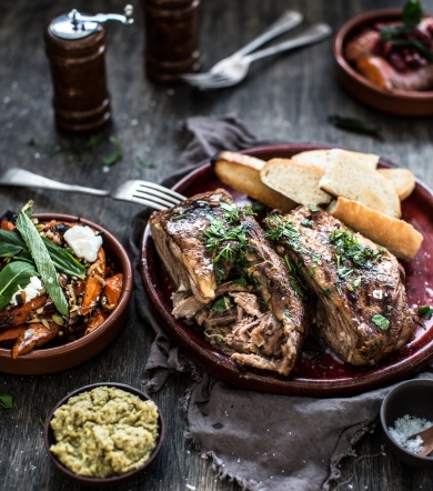 To finish the lamb – carefully remove the meat from the pot and place onto a roasting tray. Pour over some braising liquid, then roast the lamb at 200⁰C for 15 minutes, or until a crisp crust has formed.